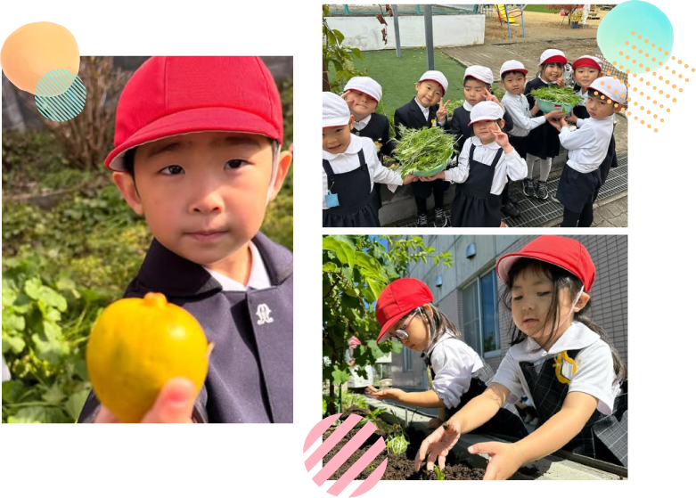 園内で食育活動を行っています。毎年、子ども達のリクエストを聞き、トマト、スイカ、ピーマン、ナス…採れたての野菜は給食室へ! 野菜が苦手な子も進んで給食が食べられるようになっています。